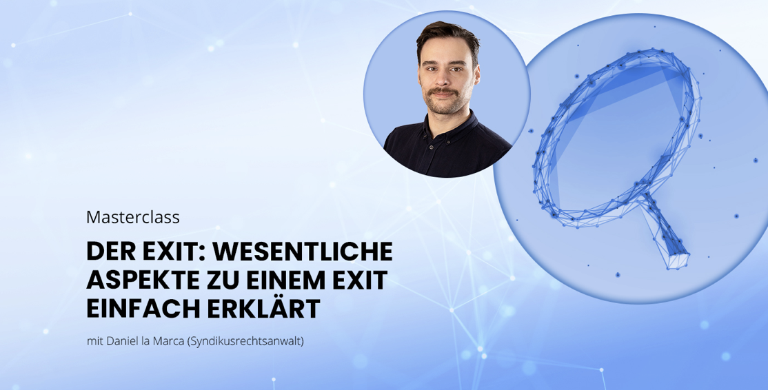 Lernen Sie von unserem Legal-Profi Daniel la Marca alles über das wichtige Thema Exit. Nach dem Event sind Sie nicht nur mit unterschiedlichen Exit-Arten vertraut, sondern auch im Fall einer Exit-Möglichkeit besser vorbereitet.