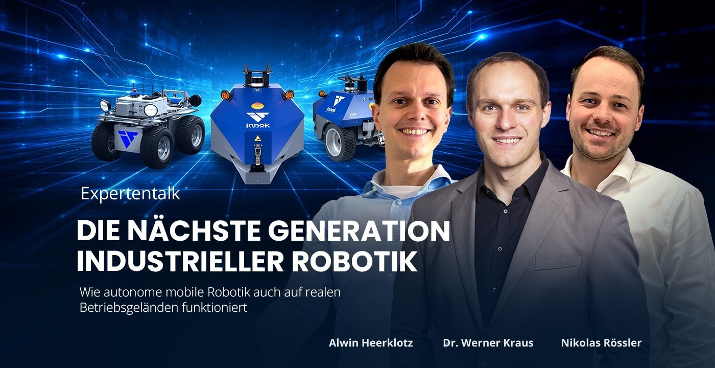 Im Expertentalk diskutieren Alwin Heerklotz (Gründer von Innok Robotics), Dr. Werner Kraus (Head of Robotics am Fraunhofer IPA) und Nikolas Rössler (CCO & CFO von Innok Robotics), wie autonome mobile Roboter auch in bestehenden Lagerumgebungen eingesetzt werden können. Innok Robotics entwickelt dafür robuste, geländegängige Roboterplattformen, die schwere Lasten transportieren und sowohl indoor als auch outdoor autonom navigieren.